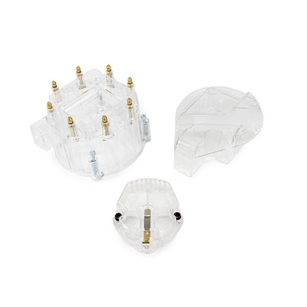 This kit includes an 8-cylinder HEI distributor cap, rotor, and Super Cap style dust cover. It’s composed of a high-strength polymer and the cap features solid brass terminals. It is designed to fit a GM or TSP HEI distributor.
