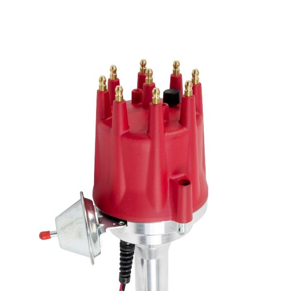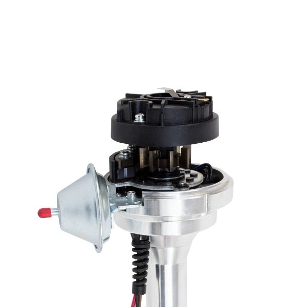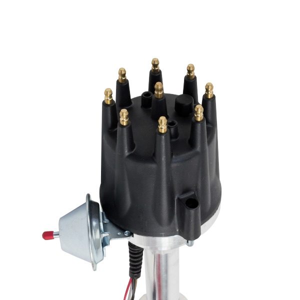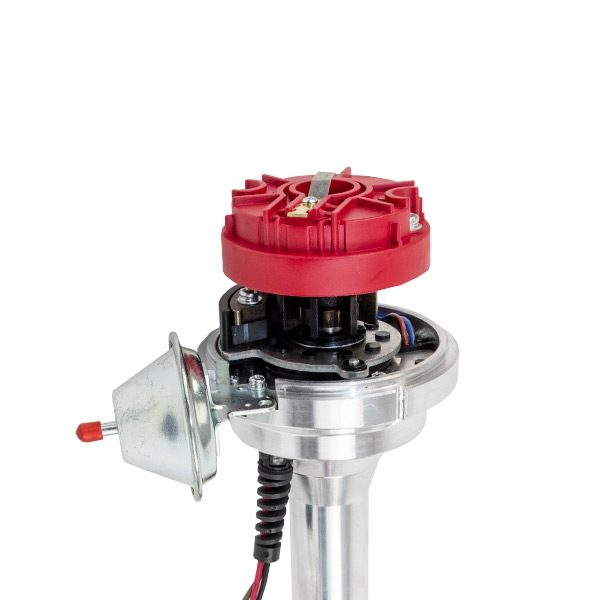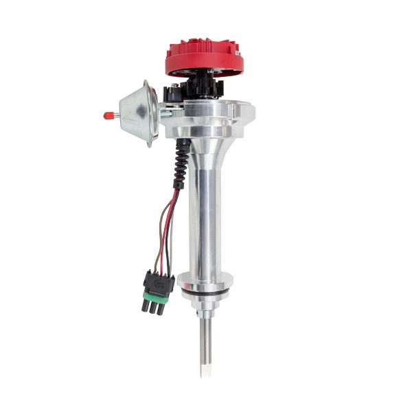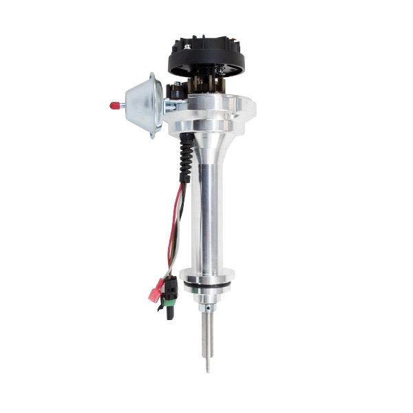 TSP’s Pro Series Ready to Run Distributor is perfect for a street performance ignition upgrade. It features a CNC-machined billet aluminum body and hardened steel shaft, with a sealed ball bearing on top and a sintered steel bushing on the bottom. It also comes with a fully adjustable mechanical advance, vacuum advance, magnetic pickup trigger, and a high-output circuit board module with digital tach output. The dielectric cap comes with solid brass terminals and a color-matched wire retainer.