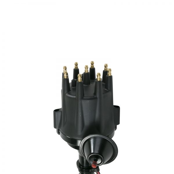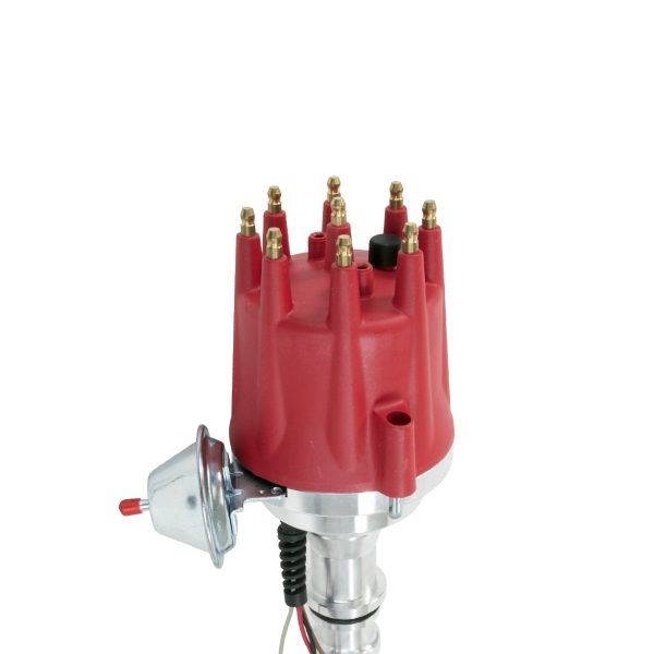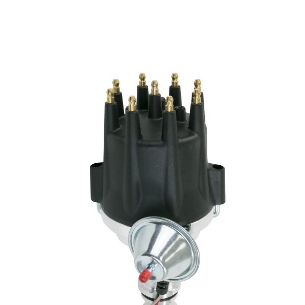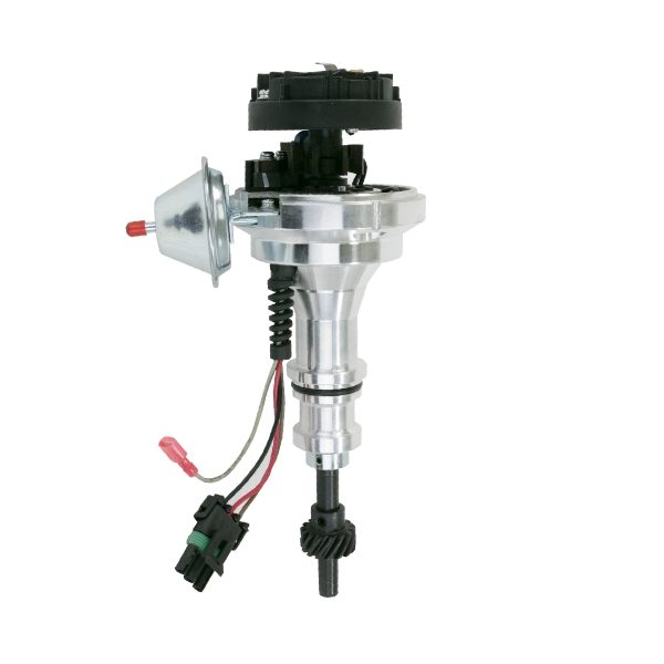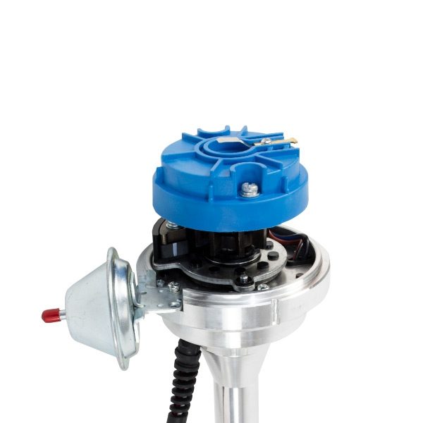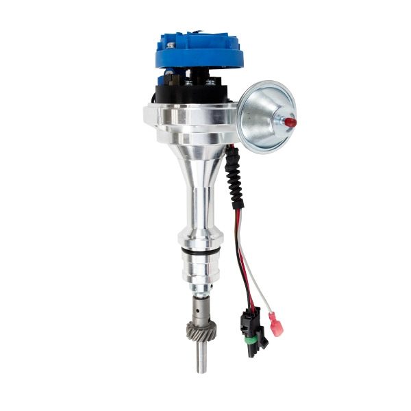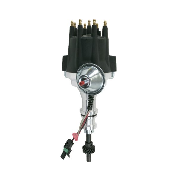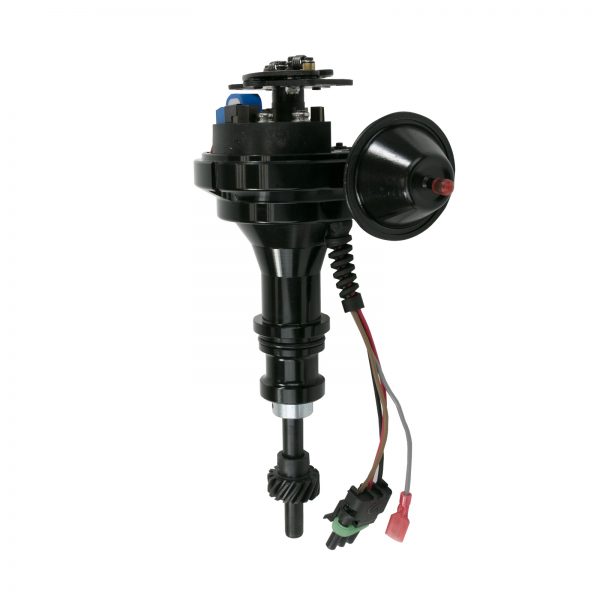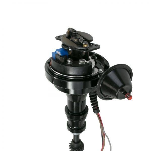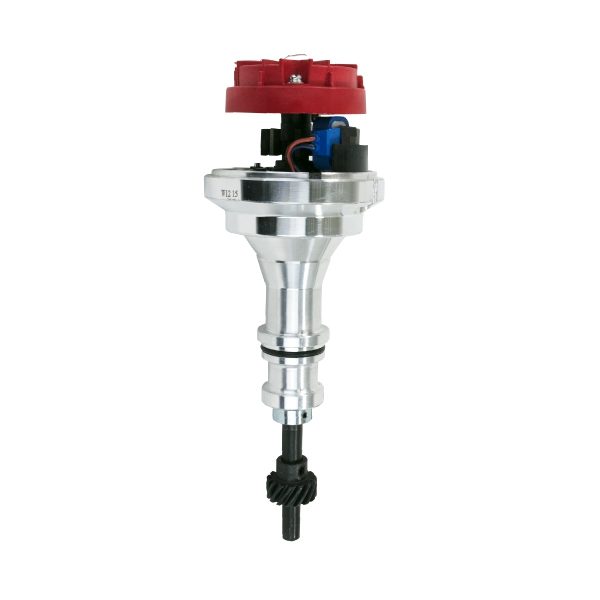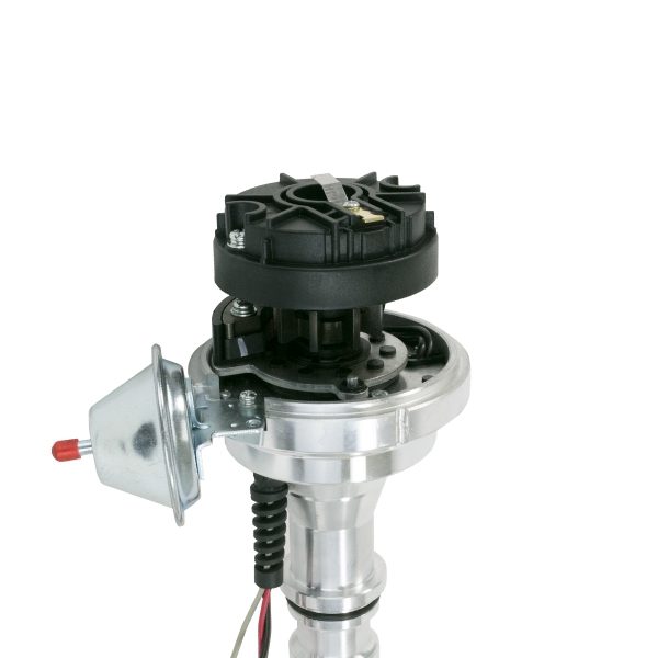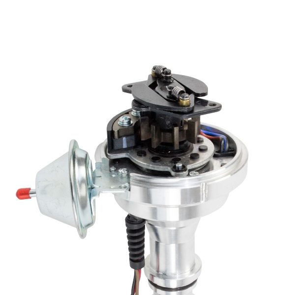 TSP’s Pro Series Ready to Run Distributor is perfect for a street performance ignition upgrade. It features a CNC-machined billet aluminum body and hardened steel shaft, with a sealed ball bearing on top and a sintered steel bushing on the bottom. It also comes with a fully adjustable mechanical advance, vacuum advance, magnetic pickup trigger, and a high-output circuit board module with digital tach output. The dielectric cap comes with solid brass terminals and a color-matched wire retainer.